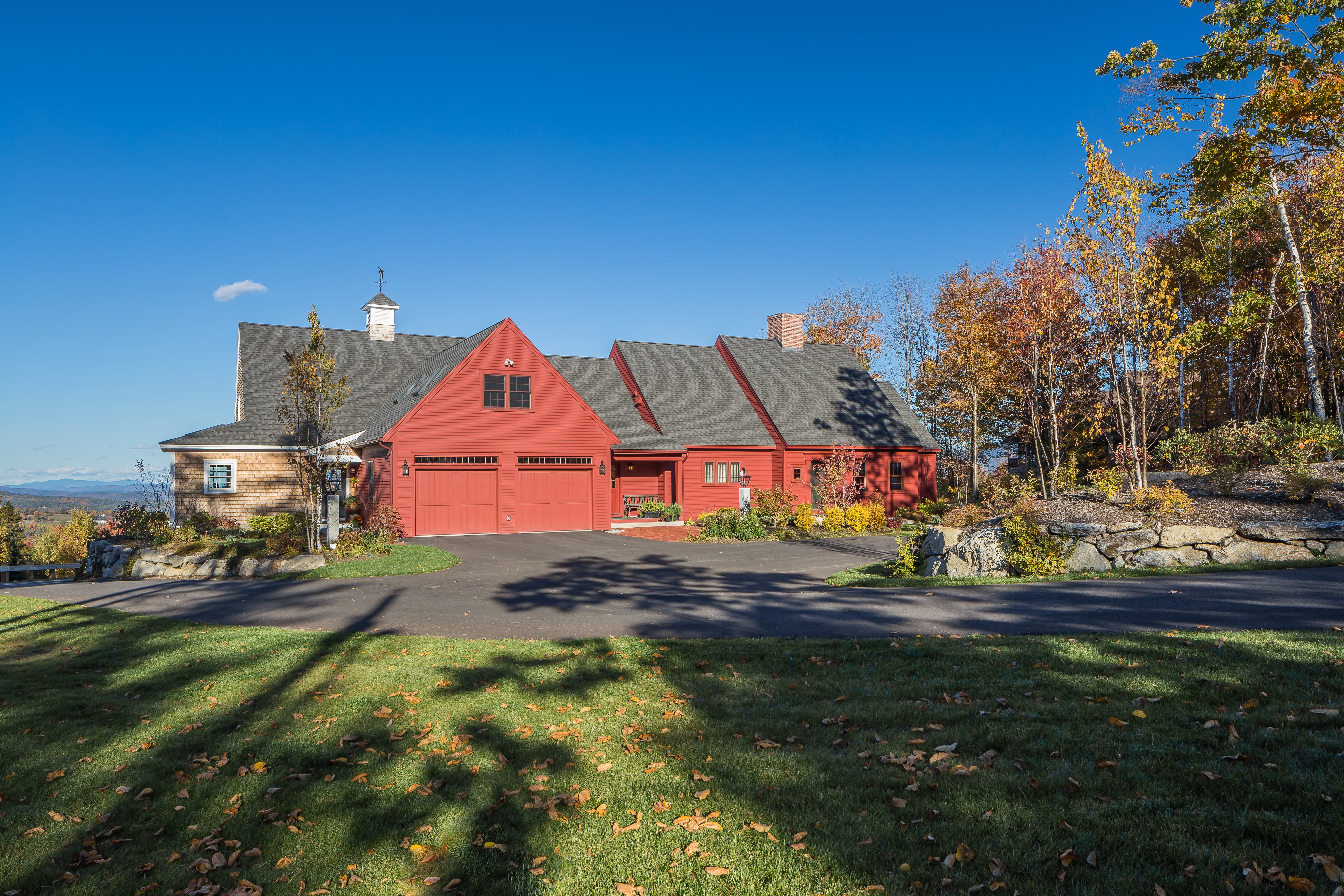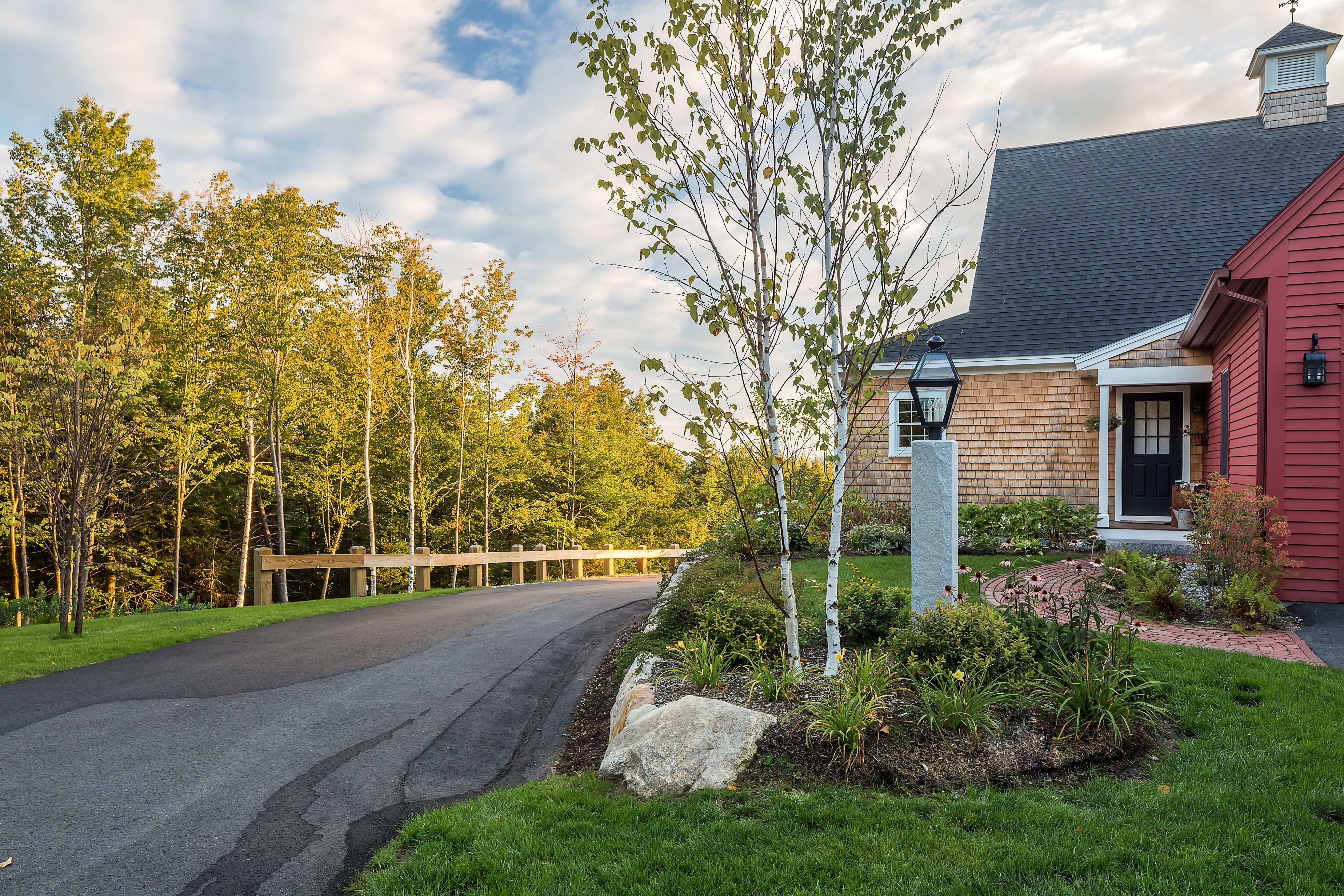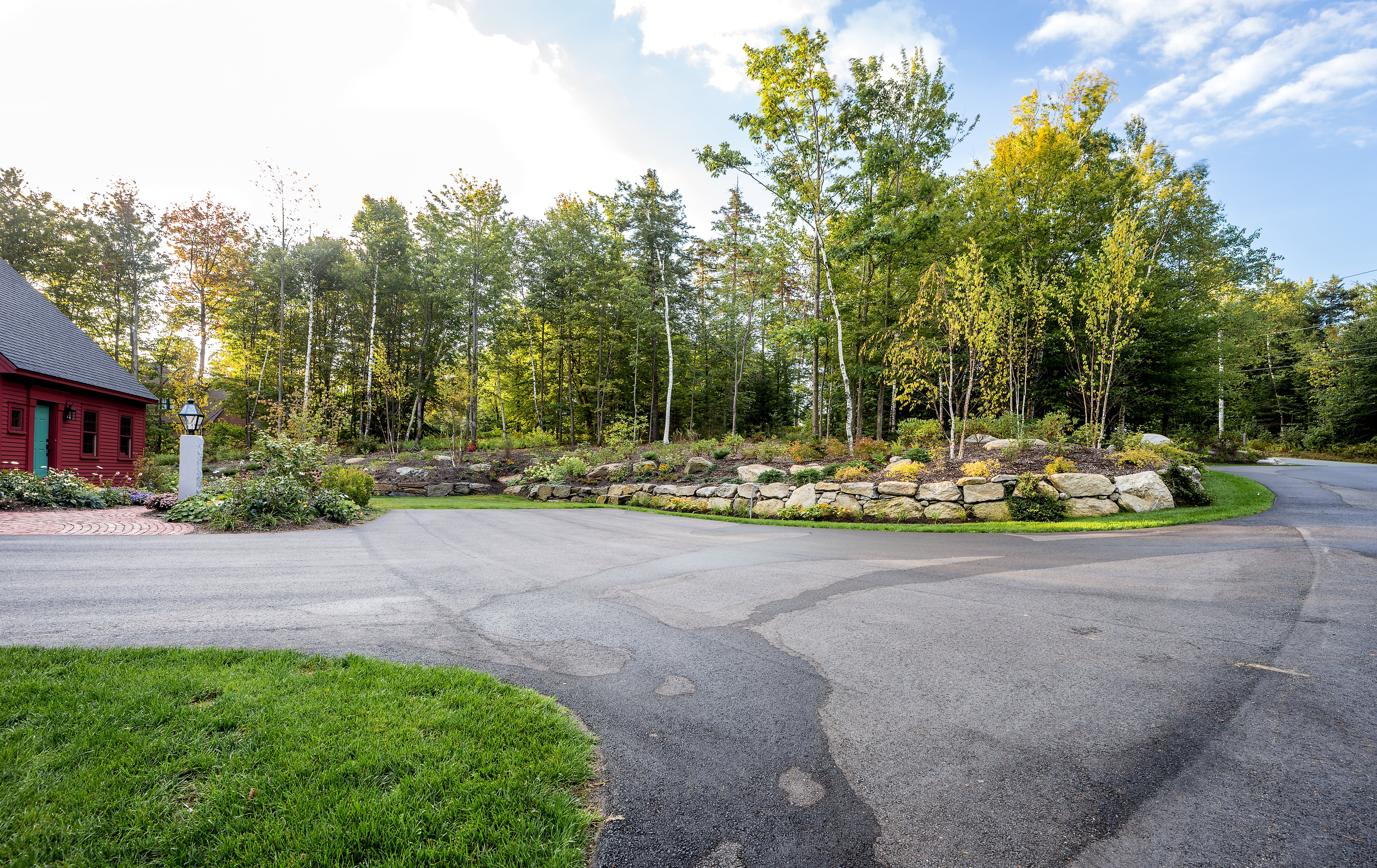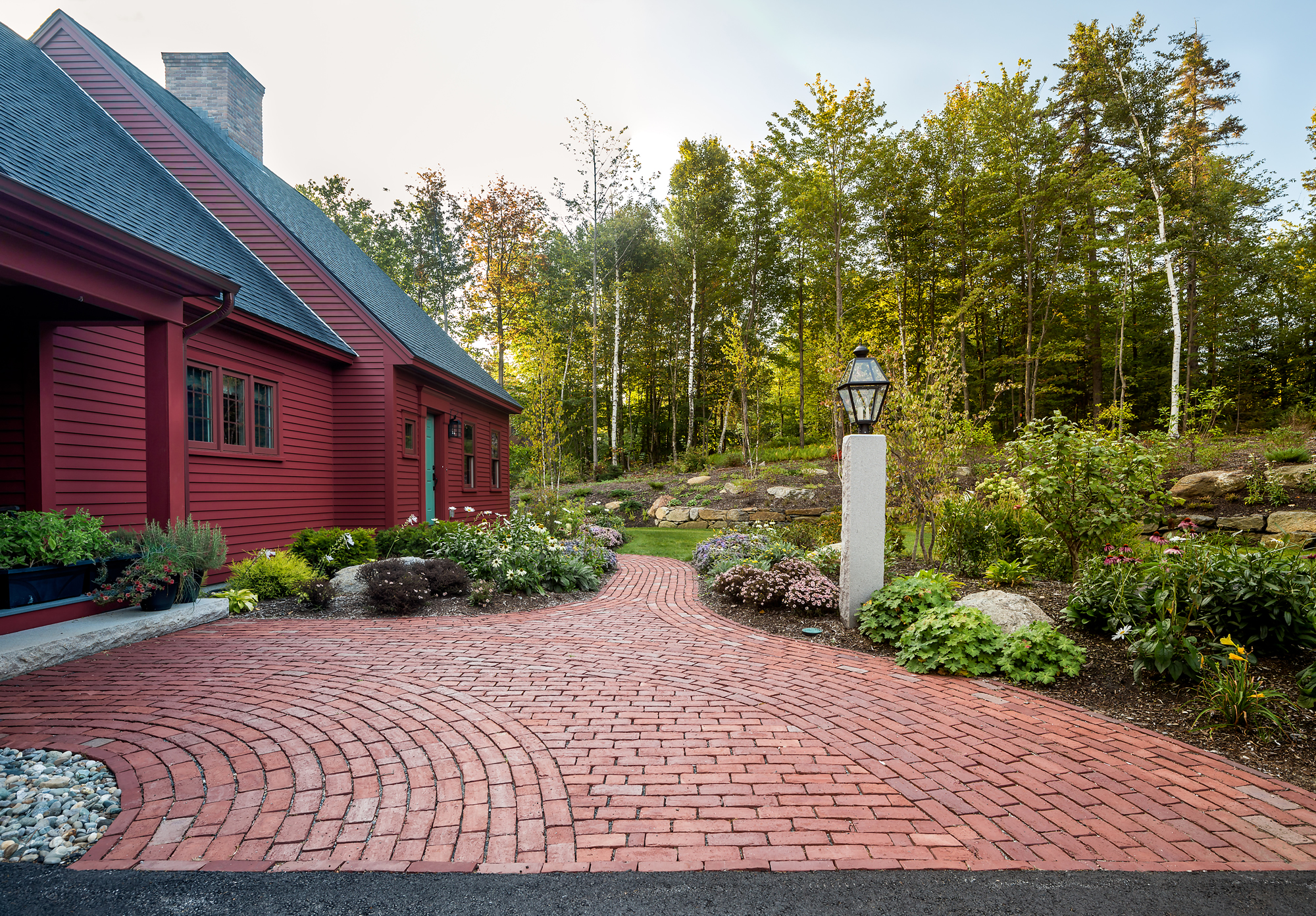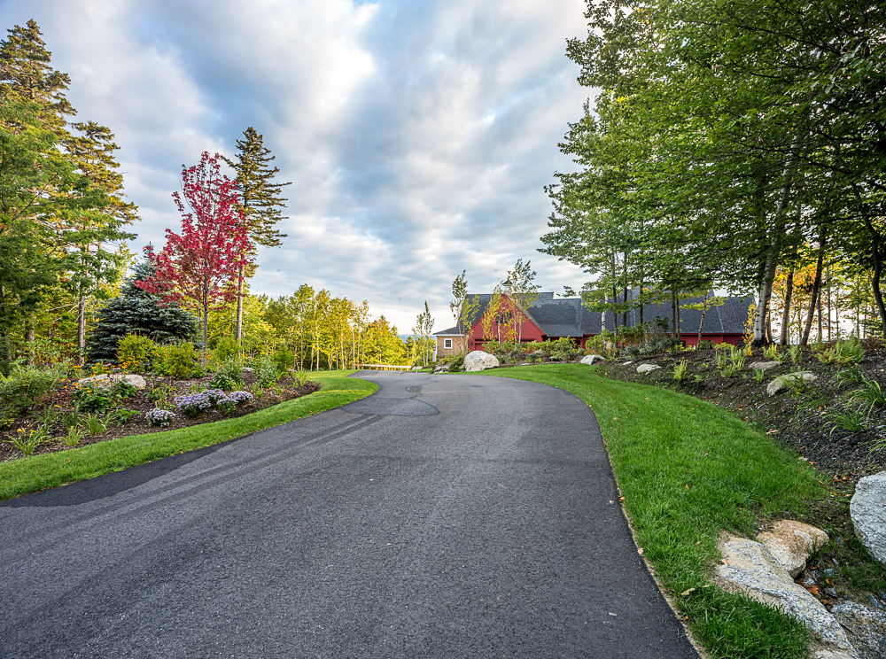 db landscaping LLC had the opportunity to create a welcoming arrival experience for this quaint mountainside home with incredible views of the valley beyond. The intricate brick and granite front walkways welcome visitors and compliment the architecture. Driveway alignment and planting beds provide privacy and interest as the front of the home is slowly revealed around the bend.